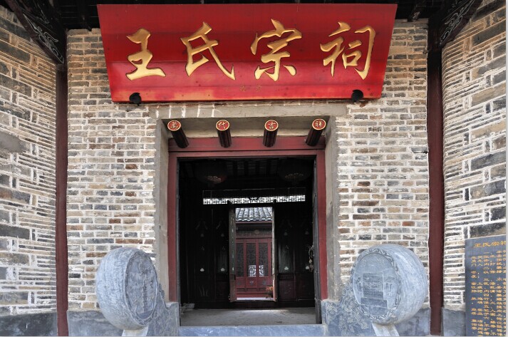 王氏宗祠属仿徽派建筑,大门两侧有一对青色抱鼓石,面上雕刻有各种图案。石鼓一侧嵌着一块门碑石,刻着进堂八禁,“保护文物,人人有责”。黑漆大门,族威肃然。门头上的四个门刻有“万代吉祥”的吉祥语,门头横匾“王氏宗祠”红底金字,耀眼夺目。